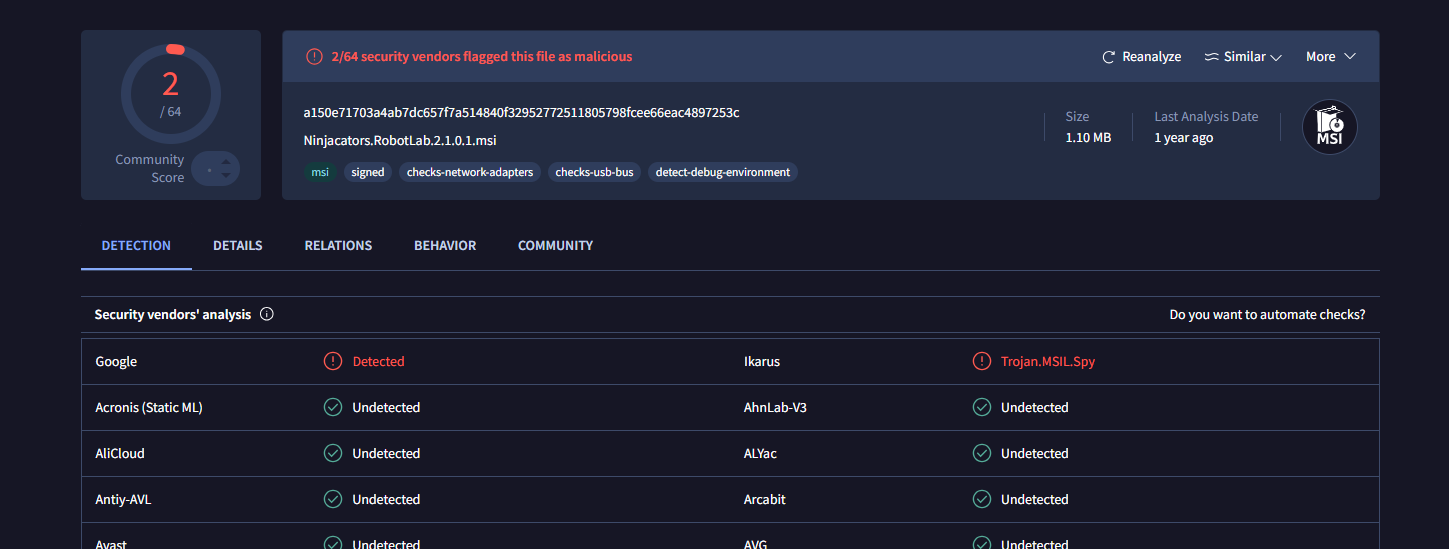 MSIL.Spy Trojan is not inside in the two DLLs Ninjacators.RobotLab and RobotLab_Telegram@Val1312q, but only in the executable file Ninjacators.RobotLab.2.1.0.1.