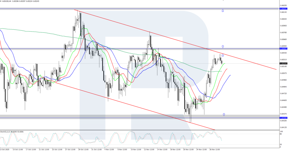 AUDUSD climbed above 0.6500 The AUDUSD rate is moderately rising, having consolidated above the 0.6500 level. The Reserve Bank of Australia does not plan to cut rates in the near term. Discover more in our analysis for 28 November 2025. AUDUSD technical analysis The AUDUSD pair is showing solid growth after reversing upwards from the daily support level at 0.6430. The Alligator indicator is pointing upwards, confirming bullish momentum. The key resistance level is 0.6550. The AUDUSD pair is rising moderately, consolidating above 0.6500. Read more - AUDUSD Forecast Attention! Forecasts presented in this section only reflect the author’s private opinion and should not be considered as guidance for trading. RoboForex bears no responsibility for trading results based on trading recommendations described in these analytical reviews. Sincerely, The RoboForex Team -