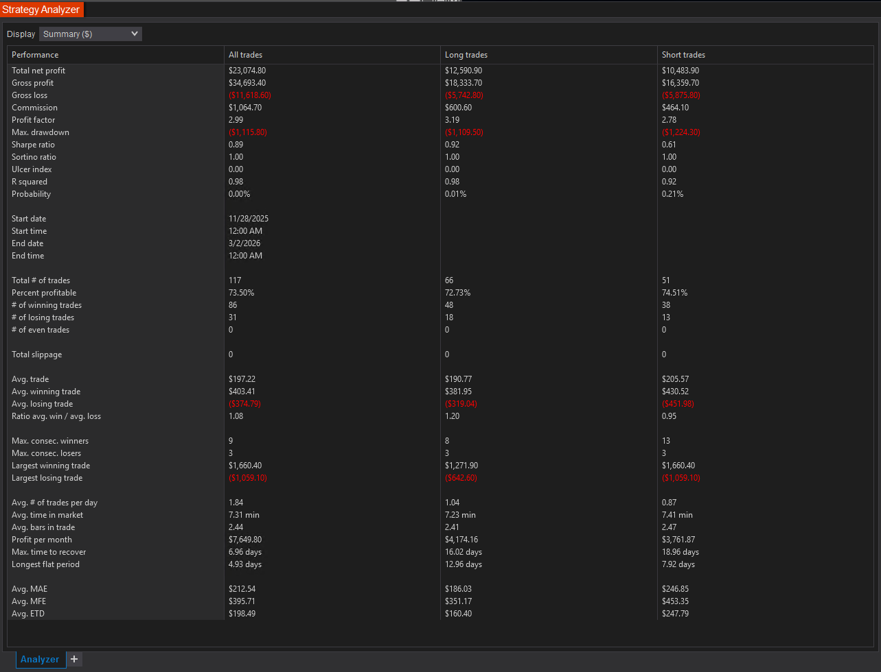 Thank you @Ninja_On_The_Roof I will check thunderzilla. You're right these srategies can be replicated, what happens is that from my experience I can have a solid strategy but somehow something fails on ninjatrader and I look for strategies that theoricly, good or bad, have been tested and do not give me the troubles I have when I run mine. Thats the main reason.