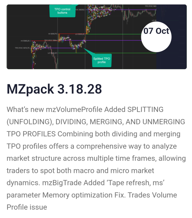 Hi, does anyone have MZPack 3.18.28 or above? (Not 3.18.8 as this is a much older version) It includes individual profile splitting, and so much more orderflow additions etc. Super super good TPO so is much superior to others shared here. If anyone could Edu or share it would be extremely appreciated! Thanks for all the help. @apmoo @kimsam