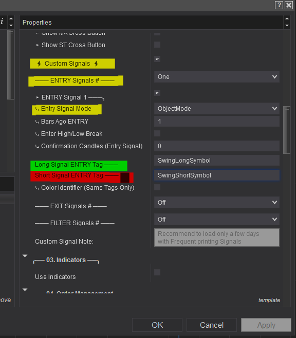 3. For SWING signals: Go to predator settings, choose "Custom signals" Entry Signals - ONE Entry Signal Mode - ObjectMode Long Signal ENTRY Tag - SwingLongSymbol Short Signal ENTRY Tag - SwingShortSymbol