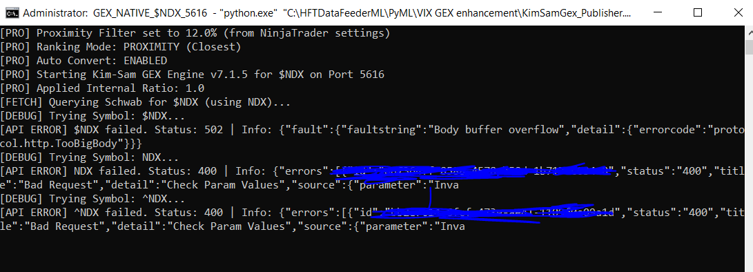 for spy chart with connect symbol blank, price multiplier 1 or 10 does not make a difference, dashboard looks like divided by ten or decimal position needs to be shifted to the right. Looks like display issue. offset always shows -191.11 on a SPX chart withconnect symbol set to SPY and price multiplier 10, offset shows as 3820.79 and dashboard shows 63.48 (either two decimals shift or it is dividing spy by 10). On a spx chart with connect symbol set to SPX price multipler 1 or 10; the py script tries spy first then starts trying alternate ones like spx ^spx $spx etc. the option chain never gets fetched even if strike range is reduced. the 502 error or indication of api call status is not output in the py console.