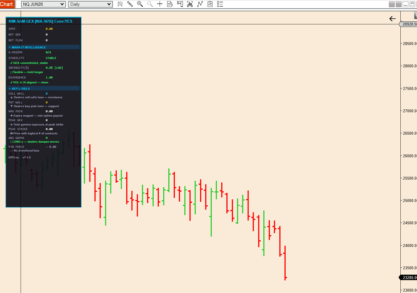 NQ chart and connect symbol is blank. Rest defaults (price multiplier is 10 defaults). Truth engine uses QQQ to get option chain and convert, but spot price is wrong in dashboard. I dont see the put and call and flip etc.