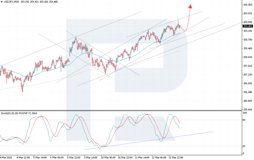 USDJPY rises amid higher oil prices and shifting expectations for Fed rates The USDJPY pair is strengthening, with the Japanese yen under increasing pressure from oil price spikes and revised expectations for US monetary policy. The rate currently stands at 159.40. Find out more in our analysis for 13 March 2026. Technical outlook The USDJPY rate continues to move within an ascending channel, with buyers holding the price above the EMA-65, indicating persistent bullish pressure. Today’s USDJPY forecast suggests another attempt to extend the rally towards 160.35. A combination of factors, such as yen weakness, rising oil prices. Read more - USDJPY Forecast Attention! Forecasts presented in this section only reflect the author’s private opinion and should not be considered as guidance for trading. RoboForex bears no responsibility for trading results based on trading recommendations described in these analytical reviews. Sincerely, The RoboForex Team -