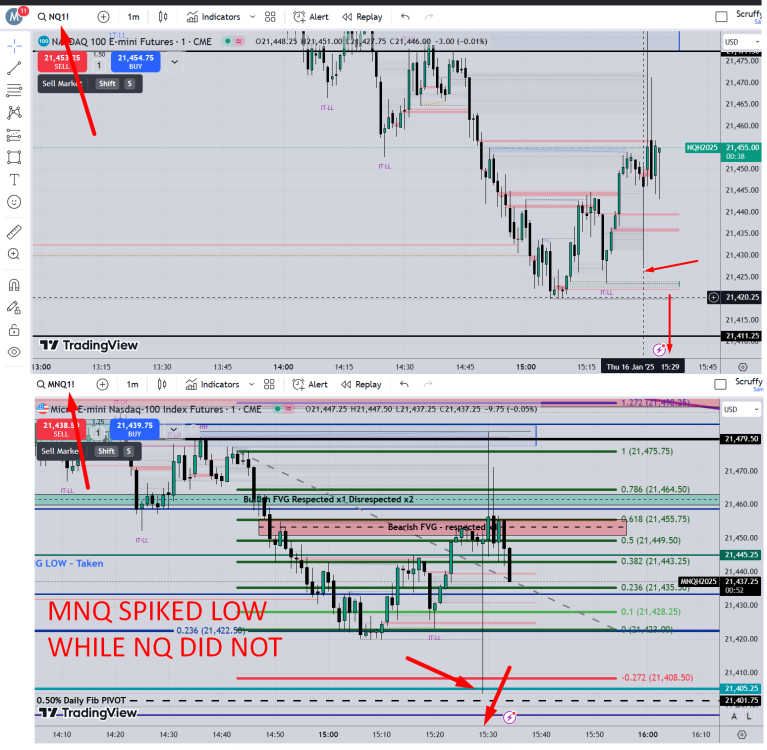 Yeah. The problem with micros is that during high volatility, like a news event, the mnqs might not get filled while Nq do get filled. In this case, mnq swept the low with a big wick during PPI while NQ didn't, so if you had a sell stop on mnq below that swing low, looking for a drop, you'd be pissed. I don't mess with mnq at red folder news events.