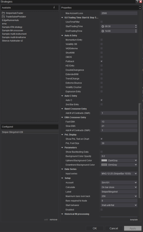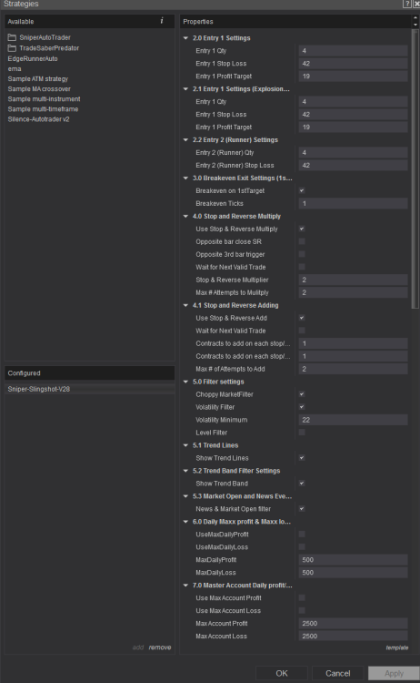 Hey bud, Sorry for the late reply to you. I have attached my settings as requested. Please note: The rest of the days trading with that strategy, was pretty crap. It takes lots of trades, some were in profit, some were in loss. One bad thing is the 'reverse' button, esp if you have 3 losing trades in a row. Takes your $600 profit into a $450 lost within a few mins.......If you stick with it, you will need to play around settings for what works for you. Maybe having a static $200 PT per day, that's doable, I think. If you have multi-prop account's, you could easy do $1000+ each day. Hope that helps. If you need anything else, ask and good luck!3 points