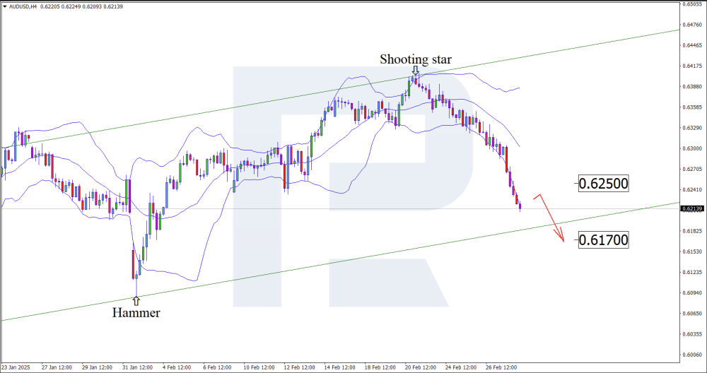 AUDUSD forecast: the Australian dollar continues to lose ground against the USD The US dollar continues to strengthen amid US economic data, with the AUDUSD rate able to decline to 0.6170 in the near term. Discover more in our analysis for 28 February 2025. AUDUSD technical analysis Having tested the upper Bollinger band, the AUDUSD price has formed a Shooting Star reversal pattern on the H4 chart. At this stage, it continues to maintain its downward trajectory following the signal received. Since the quotes remain within the ascending channel, the price could decline to the nearest support level at 0.6170. The Australian dollar continues to fall; the AUDUSD technical analysis suggests a further decline to the 0.6170 support level. Read more - AUDUSD Forecast Attention! Forecasts presented in this section only reflect the author’s private opinion and should not be considered as guidance for trading. RoboForex bears no responsibility for trading results based on trading recommendations described in these analytical reviews. Sincerely, The RoboForex Team -