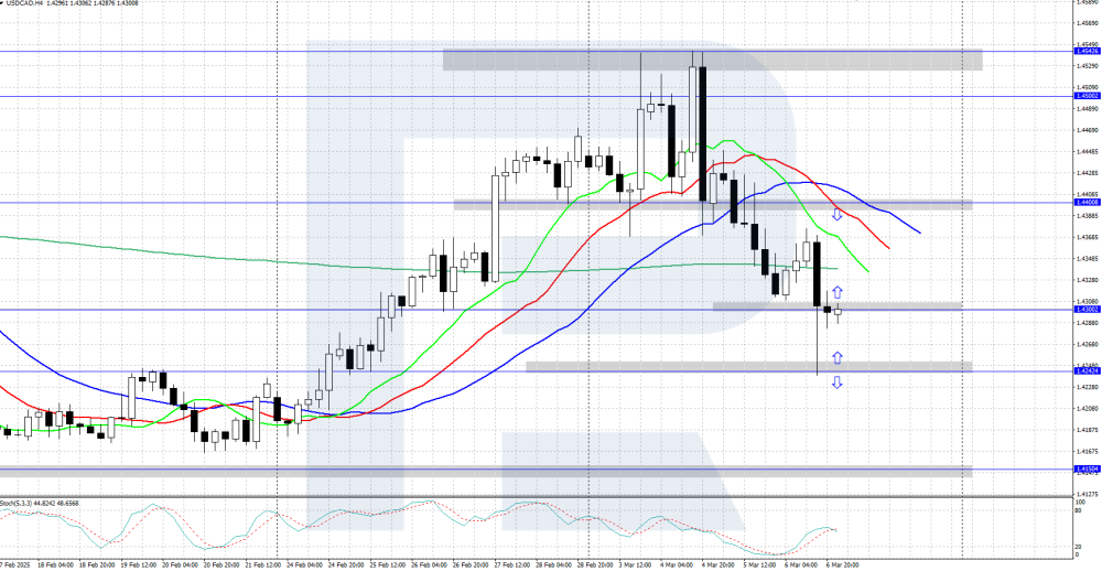 USDCAD forecast: the market awaits the Canadian and US employment statistics today The USDCAD rate is undergoing a downward correction, falling to the area around 1.4300. Today, the market will focus on employment statistics from Canada and the US. Discover more in our analysis for 7 March 2025. USDCAD technical analysis On the daily chart, the USDCAD pair is undergoing a correction within the uptrend; it formed an upward reversal from the 1.4150 support level last week. The quotes have now returned to 1.4300, while the Alligator indicator still confirms the uptrend. The USDCAD pair is correcting, plunging to 1.4300. Read more - USDCAD Forecast Attention! Forecasts presented in this section only reflect the author’s private opinion and should not be considered as guidance for trading. RoboForex bears no responsibility for trading results based on trading recommendations described in these analytical reviews. Sincerely, The RoboForex Team -