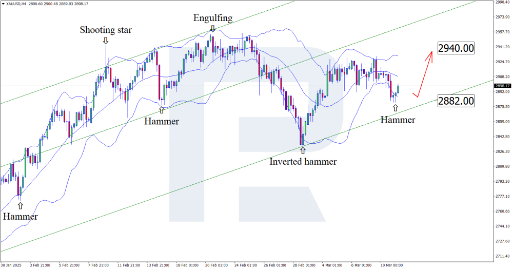 Gold (XAUUSD) continues to strengthen after a correction Active Gold purchases by central banks support Gold, potentially driving the quotes further up to the 2,940 USD level. Find more details in our XAUUSD analysis for today, 11 March 2025. XAUUSD technical analysis On the H4 chart, XAUUSD prices formed a Hammer reversal pattern near the lower Bollinger band. At this stage, they continue their upward trajectory following the signal from the pattern. The uptrend will likely continue as XAUUSD quotes are moving within the ascending channel. The upside target could be the 2,940 USD resistance level. Along with the XAUUSD technical analysis, the decline in US economic indicators suggests a continuation of the uptrend, with the quotes potentially rising to 2,940 USD. Read more - Gold Forecast Attention! Forecasts presented in this section only reflect the author’s private opinion and should not be considered as guidance for trading. RoboForex bears no responsibility for trading results based on trading recommendations described in these analytical reviews. Sincerely, The RoboForex Team -