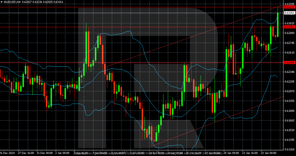 AUDUSD is at a five-week high supported by positive US and Chinese data The AUDUSD pair rose to 0.6314 on Friday. Investors are keeping an eye on the issue of US tariffs on China. Discover more in our analysis for 24 January 2025. AUDUSD technical analysis On the AUDUSD H4 chart, quotes still have an opportunity to consolidate above 0.6323. In this case, a new growth target will be the area between 0.6325 and 0.6350. The AUDUSD pair has markedly strengthened. Read more - AUDUSD Forecast Attention! Forecasts presented in this section only reflect the author’s private opinion and should not be considered as guidance for trading. RoboForex bears no responsibility for trading results based on trading recommendations described in these analytical reviews. Sincerely, The RoboForex Team -