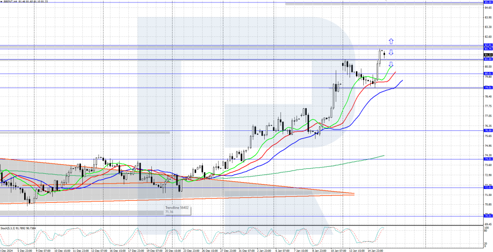 Brent consolidated above 81.00 USD Brent continues to rise steadily, with quotes surpassing the 81.00 USD level yesterday. More details in our analysis for 16 January 2025. Brent technical analysis After surging on Wednesday, Brent quotes are consolidating slightly above 81.00 USD today. The asset is trading in a strong uptrend on the daily chart, with the Alligator indicator below the price chart and directed upwards, confirming the asset’s current strengthening trend. Brent prices rose above 81.00 USD amid slowing inflation and reduced US crude oil reserves. Read more - Brent Forecast Attention! Forecasts presented in this section only reflect the author’s private opinion and should not be considered as guidance for trading. RoboForex bears no responsibility for trading results based on trading recommendations described in these analytical reviews. Sincerely, The RoboForex Team -