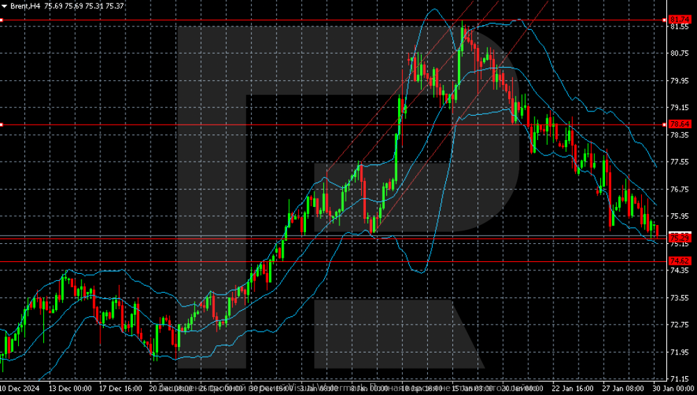 Brent prices are falling: external pressure is too great Brent prices plunged to 76.55 USD, with US oil inventories increasing again. Find out more in our analysis for 30 January 2025. Brent technical analysis Prerequisites for the extension of the selling wave to 74.62 are forming on the Brent H4 chart. After testing this level, the market may turn to 75.30, but additional conditions are needed to move to a more ambitious target of 78.64. Brent prices are falling, without halting this movement yet. Read more - Brent Forecast Attention! Forecasts presented in this section only reflect the author’s private opinion and should not be considered as guidance for trading. RoboForex bears no responsibility for trading results based on trading recommendations described in these analytical reviews. Sincerely, The RoboForex Team -