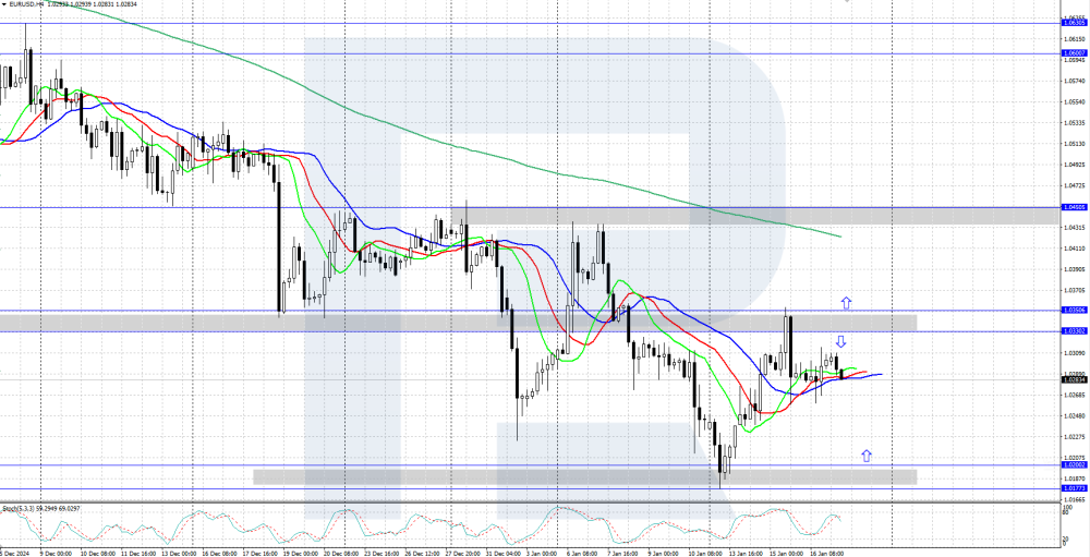 EURUSD: the pair could rise above the 1.0350 resistance level The EURUSD rate is experiencing an upward correction within a downtrend. The bulls failed to overcome the 1.0350 resistance level on their first attempt. More details in our analysis for 17 January 2025. EURUSD technical analysis On the H4 chart, the EURUSD pair is experiencing an upward correction after forming a local trough in the 1.0177-1.0200 support area. On Wednesday, the bulls attempted to overcome resistance at 1.0350 but encountered significant selling pressure and retraced, with the price currently consolidating slightly below 1.0300. The EURUSD pair failed to surpass the 1.0350 resistance level within its upward correction. Read more - EURUSD Forecast Attention! Forecasts presented in this section only reflect the author’s private opinion and should not be considered as guidance for trading. RoboForex bears no responsibility for trading results based on trading recommendations described in these analytical reviews. Sincerely, The RoboForex Team -