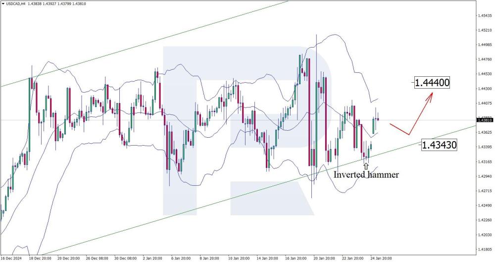 USDCAD: the Canadian dollar loses ground against the USD again Lower wholesale sales in Canada and positive US fundamental data may propel the USDCAD pair further to 1.4440. More details in our analysis for 27 January 2025. USDCAD technical analysis On the H4 chat, the USDCAD price formed an Inverted Hammer reversal pattern near the lower Bollinger band. At this stage, it continues developing a growth wave following the signal received. Since the quotes remain within an ascending channel, the upward wave is expected to continue to the nearest resistance level at 1.4440. A breakout above this level would open the potential for a more substantial uptrend. Alongside the USDCAD technical analysis, low fundamental indicators from Canada suggest growth to the 1.4440 resistance level. Read more - USDCAD Forecast Attention! Forecasts presented in this section only reflect the author’s private opinion and should not be considered as guidance for trading. RoboForex bears no responsibility for trading results based on trading recommendations described in these analytical reviews. Sincerely, The RoboForex Team -