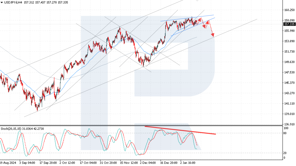 USDJPY: expectations for a BoJ rate hike support the yen The USDJPY rate is falling, with bears poised to test the 156.85 support level. More details in our analysis for 15 January 2025. USDJPY technical analysis The USDJPY quotes are declining, forming a Wedge reversal pattern. Today’s USDJPY forecast suggests that the price could attempt to test the 158.45 resistance level before falling to 154.35. A bearish divergence on the Stochastic Oscillator provides an additional signal for a downward movement. The USDJPY rate is declining, driven by expectations for a BoJ interest rate hike, which supports the yen’s strengthening. Read more - USDJPY Forecast Attention! Forecasts presented in this section only reflect the author’s private opinion and should not be considered as guidance for trading. RoboForex bears no responsibility for trading results based on trading recommendations described in these analytical reviews. Sincerely, The RoboForex Team