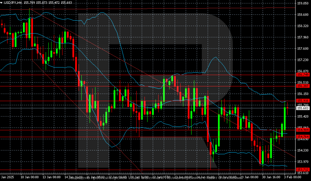 USDJPY rises: the US dollar is in demand due to higher risks The USDJPY pair rose to 155.50 at the beginning of the week. The US imposed trade tariffs on its major partners. Find out more in our analysis for 3 February 2025. USDJPY technical analysis On the H4 chart, the USDJPY pair is gaining local upward momentum to the first crucial target of 155.91. If buyers find a foothold above this level, the next upside target will be 156.38, with the subsequent crucial target at 156.74. The USDJPY pair is rising rapidly on Monday. The market is massively risk-averse as the US launched a new round of trade wars. Read more - USDJPY Forecast Attention! Forecasts presented in this section only reflect the author’s private opinion and should not be considered as guidance for trading. RoboForex bears no responsibility for trading results based on trading recommendations described in these analytical reviews. Sincerely, The RoboForex Team -