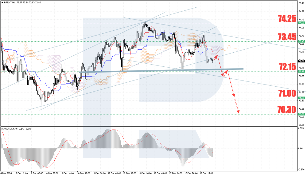 Brent falls following the Federal Reserve’s statement, with the current price at 72.63 USD Brent oil is correcting near the key support level of 72.45 USD. Find out more in our analysis for 19 December 2024. Brent technical analysis Brent prices secured a position below the lower boundary of the Ichimoku Cloud, suggesting a downtrend. Today’s Brent forecast anticipates a minor bullish correction, with prices testing the Cloud’s lower boundary at 72.85 USD before falling to 71.00 USD. Brent prices are falling amid Federal Reserve statements about a slower pace of interest rate cuts in 2025, raising concerns about fuel demand. Read more - Brent Forecast Attention! Forecasts presented in this section only reflect the author’s private opinion and should not be considered as guidance for trading. RoboForex bears no responsibility for trading results based on trading recommendations described in these analytical reviews. Sincerely, The RoboForex Team -