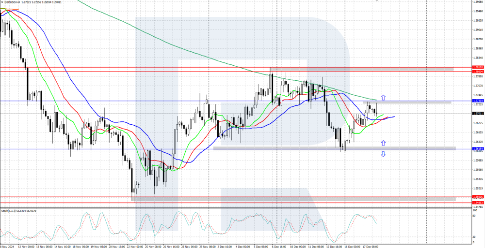 GBPUSD declines ahead of the Fed’s interest rate decision The GBPUSD rate has corrected towards 1.2700 today after reaching a weekly high of 1.2730, with market participants anticipating the outcome of the US Federal Reserve meeting. Discover more in our analysis for 18 December 2024. GBPUSD technical analysis On the H4 chart, the GBPUSD pair shows local upward momentum after bouncing from the 1.2615 support level on Monday. The alligator indicator signals growth. The GBPUSD pair is moderately correcting downwards after reaching a local weekly high of 1.2730. Read more - GBPUSD Forecast Attention! Forecasts presented in this section only reflect the author’s private opinion and should not be considered as guidance for trading. RoboForex bears no responsibility for trading results based on trading recommendations described in these analytical reviews. Sincerely, The RoboForex Team -