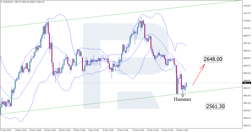Gold (XAUUSD): the asset is consolidating ahead of a rise A potential rise in US inflation expectations offers hope for Gold to climb to 2,648. Discover more in our analysis for 20 December 2024. XAUUSD technical analysis On the XAUUSD H4 chart, prices formed a hammer reversal pattern after testing the Bollinger band’s lower line. They continue their ascent at this stage, following a reversal pattern signal. This trend could develop further since the quotes are moving within an ascending channel. Possible US inflation growth, combined with XAUUSD technical analysis, suggests that prices could rise to 2,648 USD after a correction. Read more - Gold Forecast Attention! Forecasts presented in this section only reflect the author’s private opinion and should not be considered as guidance for trading. RoboForex bears no responsibility for trading results based on trading recommendations described in these analytical reviews. Sincerely, The RoboForex Team -