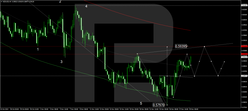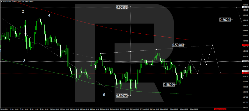 NZDUSD is under pressure: the market awaits US employment data The NZDUSD rate is declining, with sellers poised to test the 0.5845 support level. More details in our analysis for 6 December 2024. NZDUSD technical analysis The NZDUSD H4 chart shows that the market is forming a growth wave towards the local target of 0.5898. This level could be reached today, 6 December 2024, before a potential decline to 0.5860 (testing from above). The NZDUSD rate remains under pressure amid expectations of a further Reserve Bank of New Zealand interest rate cut. Read more - NZDUSD Forecast Attention! Forecasts presented in this section only reflect the author’s private opinion and should not be considered as guidance for trading. RoboForex bears no responsibility for trading results based on trading recommendations described in these analytical reviews. Sincerely, The RoboForex Team -