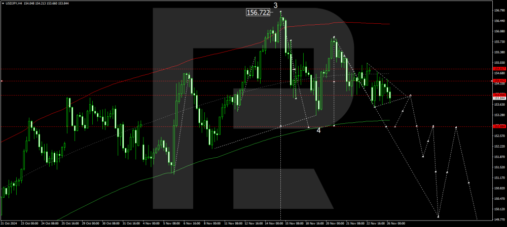 USDJPY: the yen continues its attempts to strengthen against the US dollar The decrease in Japan’s core CPI had a mixed effect on the USDJPY rate, with the pair continuing its correction. More details in our analysis for 26 November 2024. USDJPY technical analysis The USDJPY H4 chart indicates that the market has formed a narrow consolidation range above the 153.80 level. The price is expected to break below the range today, 26 November 2024, and extend the downward wave towards 152.88. The projected decline in new home sales offsets the potential increase in the CB US Consumer Confidence Index. Read more - USDJPY Forecast Attention! Forecasts presented in this section only reflect the author’s private opinion and should not be considered as guidance for trading. RoboForex bears no responsibility for trading results based on trading recommendations described in these analytical reviews. Sincerely, The RoboForex Team