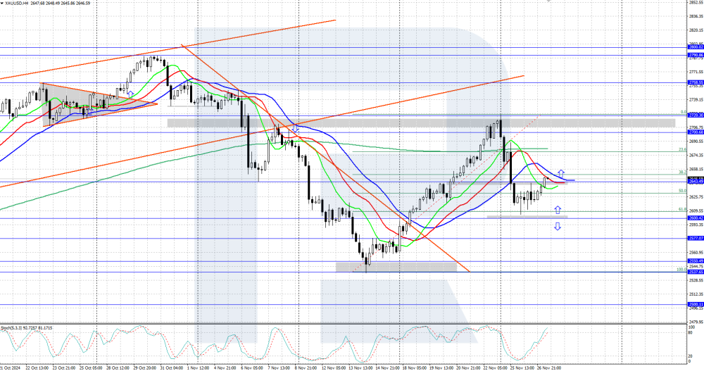 Gold (XAUUSD) has reversed upwards from 2,600 USD XAUUSD prices continue a moderate correction following last week’s surge. The quotes are now attempting to reverse upwards and continue their ascent. More details in our XAUUSD analysis for today, 27 November 2024. XAUUSD technical analysis On the H4 chart, the XAUUSD pair has corrected downwards from the 2,700-2,720 USD resistance area following last week’s steady upward movement. Yesterday, the quotes approached a strong support near the 2,600 USD level and rebounded upwards. XAUUSD quotes completed a downward correction and reversed upwards from 2,600 USD. Read more - Gold Forecast Attention! Forecasts presented in this section only reflect the author’s private opinion and should not be considered as guidance for trading. RoboForex bears no responsibility for trading results based on trading recommendations described in these analytical reviews. Sincerely, The RoboForex Team -