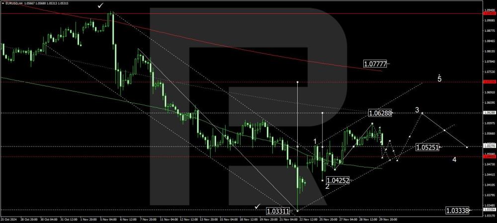 The euro is in positive territory while the US dollar rests: US sentiment shifts before the long weekend The EURUSD pair is on the rise. Investors are evaluating the US GDP and core PCE data. Find out more in our analysis for 28 November 2024. EURUSD technical analysis The EURUSD H4 chart shows that the market has completed a growth wave towards 1.0587, the first target. The structure is expected to shift downward today, 28 November 2024, targeting 1.0460 and marking the boundaries of a consolidation range. The EURUSD pair has recovered from a local low, but heightened volatility is expected due to the US Thanksgiving long weekend. Read more - EURUSD Forecast Attention! Forecasts presented in this section only reflect the author’s private opinion and should not be considered as guidance for trading. RoboForex bears no responsibility for trading results based on trading recommendations described in these analytical reviews. Sincerely, The RoboForex Team -