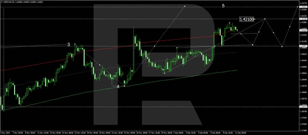 USDCAD: expectations of the Bank of Canada’s decision keep the market on edge The USDCAD rate shows a minor correction, dropping to 1.4164. More details in our analysis for 11 December 2024. USDCAD technical analysis The USDCAD H4 chart shows the market has completed a growth wave, reaching the local target of 1.4193. A consolidation range is expected to form below it today, 11 December 2024. A correction will begin with a breakout below the range, targeting 1.4100. Growth in the USDCAD pair is driven by the strengthening of the US dollar due to strong employment statistics. Read more - USDCAD Forecast Attention! Forecasts presented in this section only reflect the author’s private opinion and should not be considered as guidance for trading. RoboForex bears no responsibility for trading results based on trading recommendations described in these analytical reviews. Sincerely, The RoboForex Team -