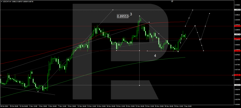 USDCHF strengthens amid a decline in Switzerland’s PMI The USDCHF rate is advancing towards the 0.8905 resistance level. Discover more in our analysis for 3 December 2024. USDCHF technical analysis The USDCHF H4 chart shows that the market has completed a growth wave, reaching 0.8855. A consolidation range is forming around this level today, 3 December 2024. With an upward breakout, the growth wave could extend towards 0.8910, potentially continuing towards 0.8989. The USDCHF rate continues to strengthen amid expectations of robust US economic statistics and geopolitical risks stemming from Trump’s statements. Read more - USDCHF Forecast Attention! Forecasts presented in this section only reflect the author’s private opinion and should not be considered as guidance for trading. RoboForex bears no responsibility for trading results based on trading recommendations described in these analytical reviews. Sincerely, The RoboForex Team -