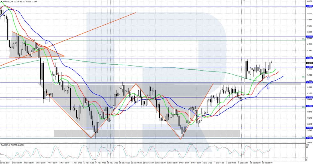 Silver (XAGUSD) prices hold above 32.00 USD The XAGUSD pair has formed a reversal towards the long-term uptrend on the daily chart, rising above 32.00 USD. Further growth may occur soon. Find out more in our Silver price analysis for today, 12 December 2024. XAGUSD technical analysis Silver prices have been moving upward this week, holding above 32.00 USD. The daily chart shows a double-bottom bullish reversal pattern, with the price moving towards the pattern’s target near 33.00 USD. XAGUSD prices remain above 32.00 USD, with the chart showing a double-bottom reversal pattern. Read more - Silver Forecast Attention! Forecasts presented in this section only reflect the author’s private opinion and should not be considered as guidance for trading. RoboForex bears no responsibility for trading results based on trading recommendations described in these analytical reviews. Sincerely, The RoboForex Team -