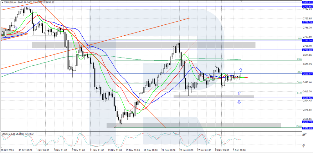 Gold (XAUUSD) awaits US employment data XAUUSD prices are consolidating within a narrow range, close to 2,650 USD, as market participants await today’s ADP US employment statistics. Find out more in our XAUUSD analysis for today, 4 December 2024. XAUUSD technical analysis On the H4 chart, the XAUUSD pair has secured above 2,600 USD, with prices now hovering around 2,650 USD. If the correction is complete, the asset could continue its ascent to the all-time high of 2,790 USD within the long-term uptrend. Gold (XAUUSD) has gained a foothold above 2,600 USD. Read more - Gold Forecast Attention! Forecasts presented in this section only reflect the author’s private opinion and should not be considered as guidance for trading. RoboForex bears no responsibility for trading results based on trading recommendations described in these analytical reviews. Sincerely, The RoboForex Team -