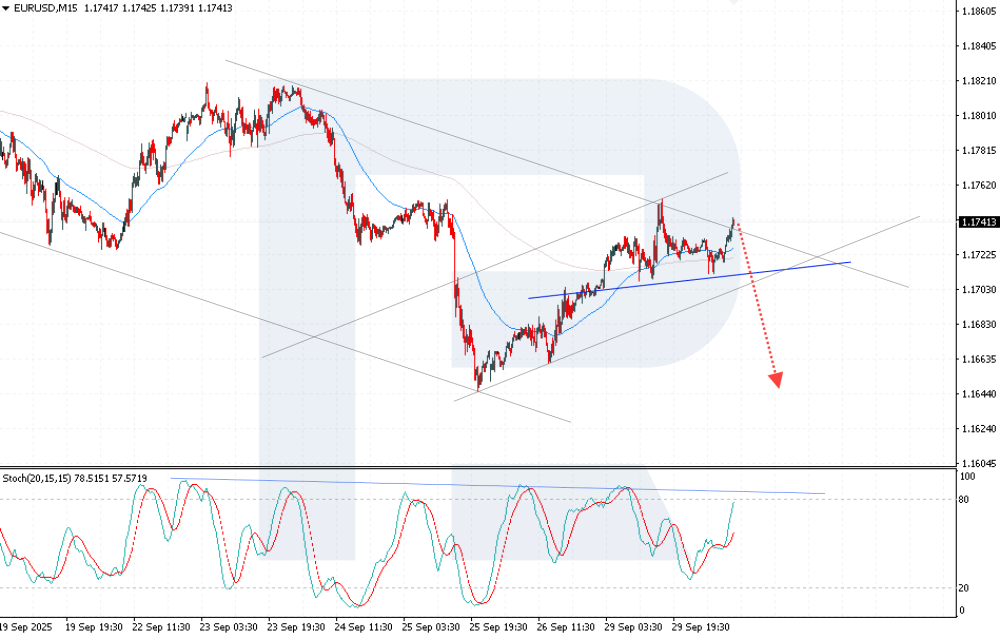 Head and Shoulders pattern formation threatens EURUSD bulls The EURUSD rate continues to strengthen amid pressure on the US dollar and growing expectations of further Fed easing. The rate currently stands at 1.1741. Find out more in our analysis for 30 September 2025. EURUSD technical analysis While the EURUSD rate remains within an upward channel, the current strengthening is capped by the resistance zone near 1.1745. The chart shows the formation of a Head and Shoulders reversal pattern. Additional pressure on the pair comes from the Stochastic Oscillator signal, where the indicator lines have approached overbought territory and are showing readiness to turn downwards. Fundamental factors support euro growth; however, technical analysis of EURUSD points to a high risk of a bearish scenario with a breakout below the support level and a decline towards 1.1645. Read more - EURUSD Forecast Attention! Forecasts presented in this section only reflect the author’s private opinion and should not be considered as guidance for trading. RoboForex bears no responsibility for trading results based on trading recommendations described in these analytical reviews. Sincerely, The RoboForex Team -