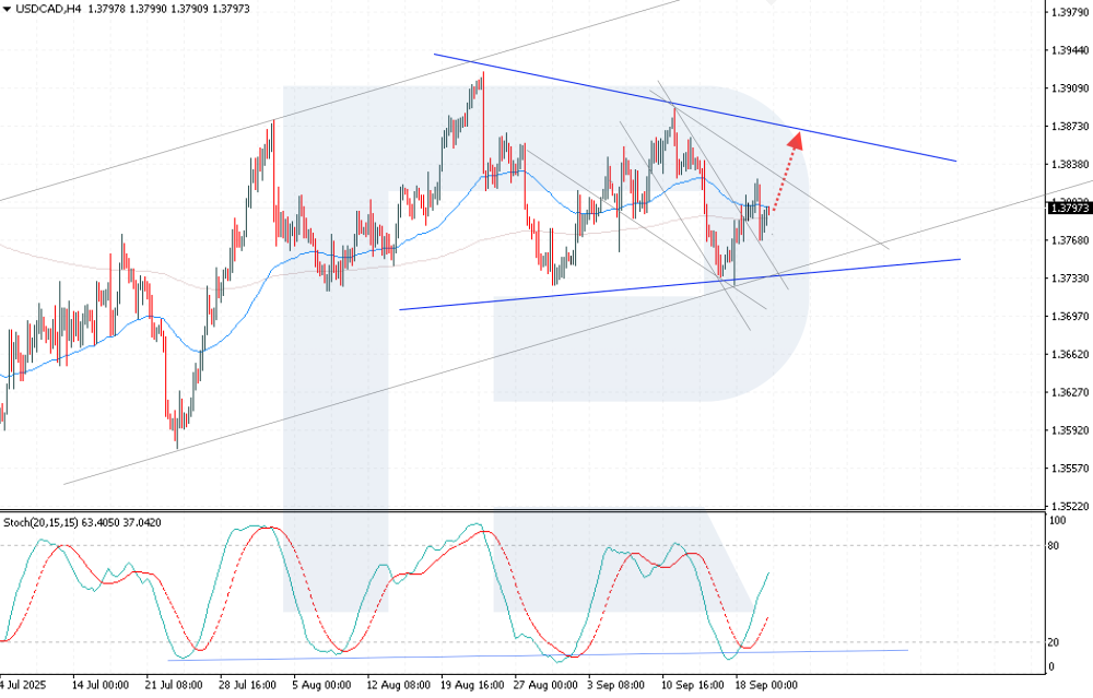 USDCAD: Bank of Canada’s dovish stance supports the US dollar The USDCAD pair remains locked within a Triangle pattern, driven by diverging monetary policies of the Fed and the Bank of Canada. The exchange rate currently stands at 1.3797. Find out more in our analysis for 22 September 2025. USDCAD technical analysis The USDCAD rate is trading within a developing Triangle pattern. The pair recently bounced from the upper boundary of the descending channel and is attempting to hold above the Moving Averages, indicating sustained buying pressure. The combination of the Bank of Canada’s dovish policy and expectations of guidance from the Fed creates conditions for further US dollar strength. Read more - USDCAD Forecast Attention! Forecasts presented in this section only reflect the author’s private opinion and should not be considered as guidance for trading. RoboForex bears no responsibility for trading results based on trading recommendations described in these analytical reviews. Sincerely, The RoboForex Team
