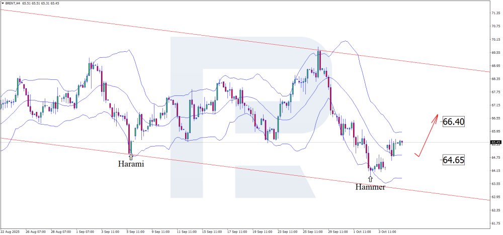 Brent gains momentum: China and OPEC+ are changing the rules of the oil market Brent crude prices are recovering after a decline, with quotes testing the 65.40 USD level. Discover more in our analysis for 7 October 2025. Brent technical analysis Having tested the lower Bollinger Band, Brent prices formed a Hammer reversal pattern on the H4 chart. At this stage, the market is developing a growth wave following this signal. Overall, Brent crude dynamics on 7 October 2025 remain moderately positive. Read more - Brent Forecast Attention! Forecasts presented in this section only reflect the author’s private opinion and should not be considered as guidance for trading. RoboForex bears no responsibility for trading results based on trading recommendations described in these analytical reviews. Sincerely, The RoboForex Team -