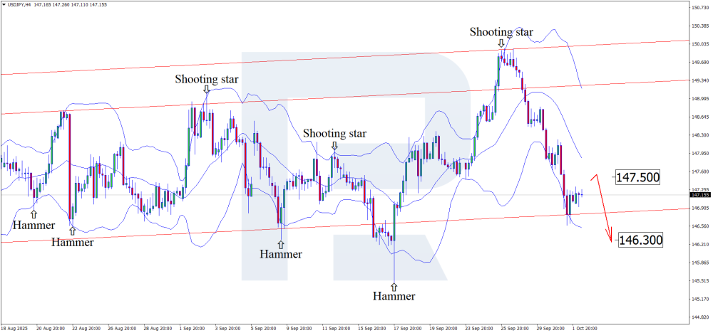 USDJPY falls: BoJ tightening and political coordination weigh on the dollar Strengthening arguments for monetary tightening in Japan continue to support the yen, with quotes currently trading near 147.10. Find out more in our analysis for 2 October 2025. USDJPY technical analysis Having tested the upper Bollinger Band, the USDJPY pair formed a Shooting Star reversal pattern on the H4 chart, currently hovering around 149.70. At this stage, the pair continues its downward wave in line with the pattern signal. The yen continues to strengthen amid anticipation of the Federal Reserve’s rate decision. Read more - USDJPY Forecast Attention! Forecasts presented in this section only reflect the author’s private opinion and should not be considered as guidance for trading. RoboForex bears no responsibility for trading results based on trading recommendations described in these analytical reviews. Sincerely, The RoboForex Team -