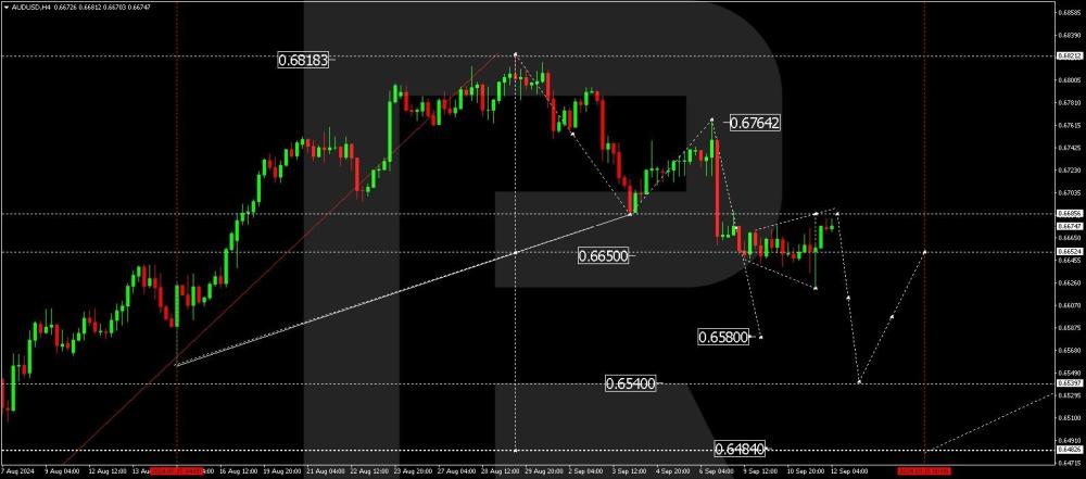 AUDUSD is poised for growth, supported by global positive sentiment AUDUSD is strengthening for the second consecutive day, with the market favouring risk. Find out more in our analysis for 12 September 2024. AUDUSD technical analysis The AUDUSD H4 chart shows that the market has completed a downward wave, reaching 0.6622. A correction towards 0.6686 is expected today, 12 September 2024. Once the correction is complete, the AUDUSD rate is expected to decline to 0.6650. The AUDUSD pair is rising for the second consecutive day, supported by a growing risk appetite. Read more - AUDUSD Forecast Attention! Forecasts presented in this section only reflect the author’s private opinion and should not be considered as guidance for trading. RoboForex bears no responsibility for trading results based on trading recommendations described in these analytical reviews. Sincerely, The RoboForex Team