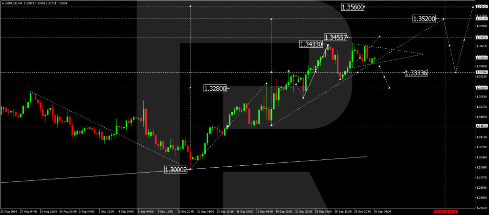 GBPUSD analysis: growth continues amid uncertain prospects GBPUSD continues to grow, with the pound needing to break out of the sideways channel. Read more in our GBPUSD analysis and forecast for today, 30 September 2024. GBPUSD technical analysis On the H4 chart, GBPUSD continues to develop its growth structure within the ascending channel. GBPUSD has found support near the channel’s lower boundary at 1.3366, and the pair is now moving towards 1.3455. Today’s GBPUSD forecast suggests that this level should be reached, followed by a decline to 1.3380 (at minimum). GBPUSD is in an upward trend, though the rise is expected to be cautious. Read more - GBPUSD Forecast Attention! Forecasts presented in this section only reflect the author’s private opinion and should not be considered as guidance for trading. RoboForex bears no responsibility for trading results based on trading recommendations described in these analytical reviews. Sincerely, The RoboForex Team -