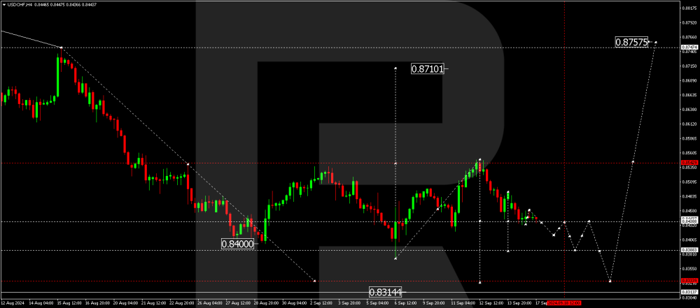 USDCHF declines: the US dollar is in a disadvantageous position The USDCHF pair continues to fall, with the Swiss franc benefiting from the weakness of the US dollar. Find out more in our analysis for 17 September 2024. USDCHF technical analysis The USDCHF H4 chart shows that the market has completed a growth wave, reaching 0.8549. A corrective structure has fully formed today, 17 September 2024, aiming for 0.8434. A consolidation range is currently developing above this level. The USDCHF pair remains under pressure until the end of the US Federal Reserve meeting. Read more - USDCHF Forecast Attention! Forecasts presented in this section only reflect the author’s private opinion and should not be considered as guidance for trading. RoboForex bears no responsibility for trading results based on trading recommendations described in these analytical reviews. Sincerely, The RoboForex Team -