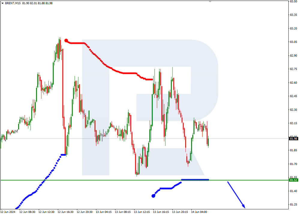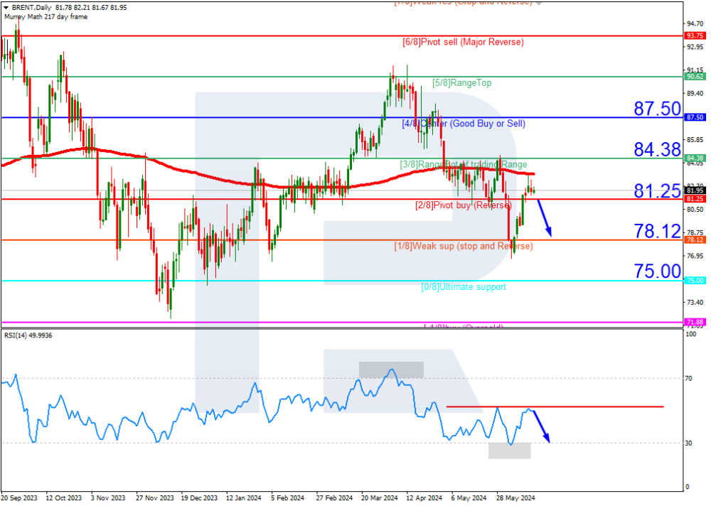 Murrey Math Lines 14.06.2024 (Brent, S&P 500) Brent Brent crude oil quotes are below the 200-day Moving Average on D1, indicating a prevailing downtrend. The RSI is testing the resistance line. In this situation, the price is expected to break the 2/8 (81.25) level, rebound, and fall to the support at 1/8 (78.12). Surpassing the 3/8 (84.38) level could invalidate this scenario, propelling the quotes to the resistance at 4/8 (87.50). On M15, a breakout of the VoltyChannel lower line will provide an additional signal for a price decline. S&P 500 S&P 500 quotes and the RSI are in the overbought areas on D1. In this situation, the price is expected to breach the +1/8 (5312.5) level and decline to the 8/8 (5000.0) support level. The scenario could be invalidated by surpassing the +2/8 (5625.0) level, which might reshuffle the Murrey indication, setting new price movement targets. Read more - Murrey Math Lines (Brent, S&P 500) Attention! Forecasts presented in this section only reflect the author’s private opinion and should not be considered as guidance for trading. RoboForex bears no responsibility for trading results based on trading recommendations described in these analytical reviews. Sincerely, The RoboForex Team -