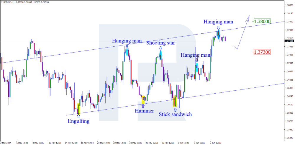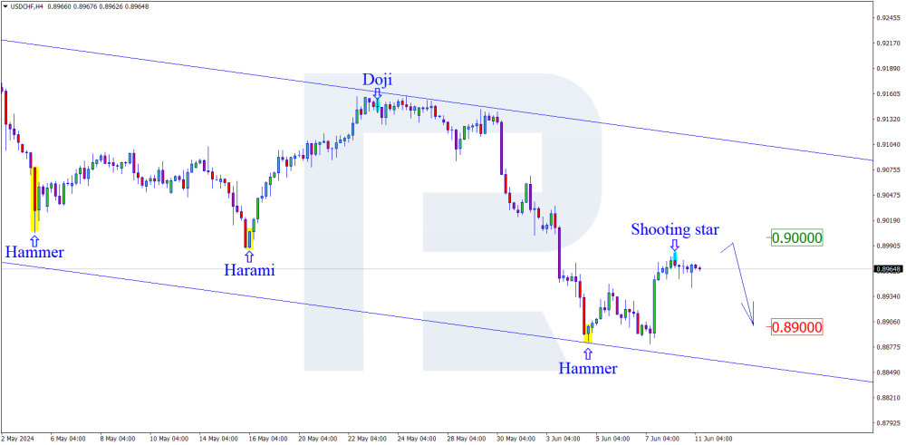 Japanese Candlesticks Analysis 11.06.2024 (USDCAD, AUDUSD, USDCHF) USDCAD, “US Dollar vs Canadian Dollar” USDCAD has formed a Hanging Man reversal pattern on H4. The instrument is currently following the reversal signal in a descending wave. The decline target could be 1.3730. Next, the price might rebound from the support level and continue its upward momentum. However, the quotes could rise to 1.3800 without a correction. AUDUSD, “Australian Dollar vs US Dollar” AUDUSD has formed an Inverted Hammer reversal pattern on H4. The instrument is currently following the reversal signal in an ascending wave. The growth target could be 0.6645. After testing the resistance level, the quotes could break above it and maintain their upward trajectory. However, the price might pull back to 0.6580 before rising. USDCHF, “US Dollar vs Swiss Franc” USDCHF has formed a Shooting Star reversal pattern on H4. The instrument is currently following the reversal signal in a descending wave. The decline target could be 0.8900. After testing the support level, the price might breach it and continue to develop a downtrend. However, the price could correct to 0.9000 before declining. Read more - Japanese Candlesticks Analysis (USDCAD, AUDUSD, USDCHF) Attention! Forecasts presented in this section only reflect the author’s private opinion and should not be considered as guidance for trading. RoboForex bears no responsibility for trading results based on trading recommendations described in these analytical reviews. Sincerely, The RoboForex Team -