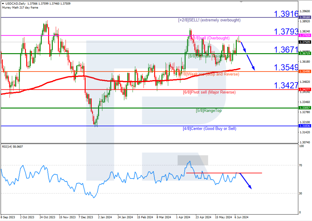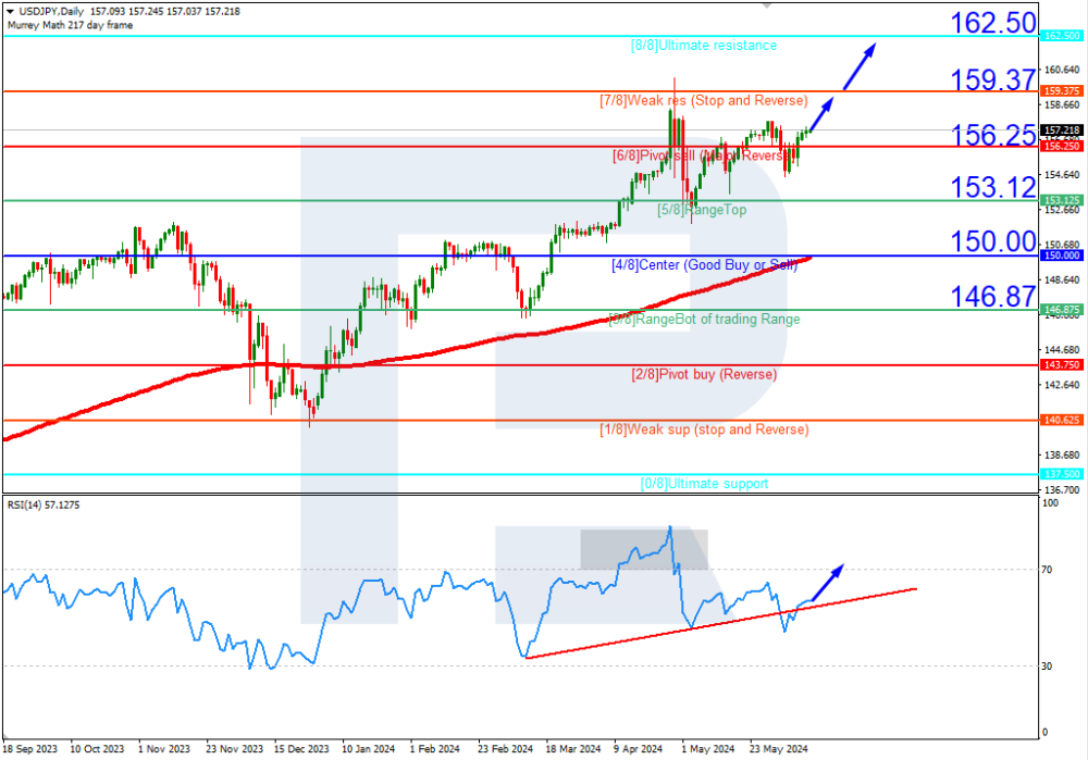 Murrey Math Lines 12.06.2024 (USDJPY, USDCAD) USDJPY, “US Dollar vs Japanese Yen” USDJPY quotes are above the 200-day Moving Average on D1, indicating a prevailing uptrend. The RSI has breached the resistance line. In this situation, the price is expected to test the 7/8 (159.37) level, break above it, and rise to the resistance at 8/8 (162.50). A breakout below the 5/8 (153.12) support level could cancel this scenario, leading to a potential decline to 4/8 (150.00). On M15, a breakout above the upper line of the VoltyChannel would provide an additional signal supporting the price increase. USDCAD, “US Dollar vs Canadian Dollar” USDCAD quotes are in the overbought area on D1. The RSI is testing the resistance line. In this situation, the price is expected to break the 8/8 (1.3671) level and decline to the support at 7/8 (1.3549). Surpassing the +1/8 (1.3793) level could cancel this scenario, leading to a potential rise to the +2/8 (1.3916) resistance level. Read more - Murrey Math Lines (USDJPY, USDCAD) Attention! Forecasts presented in this section only reflect the author’s private opinion and should not be considered as guidance for trading. RoboForex bears no responsibility for trading results based on trading recommendations described in these analytical reviews. Sincerely, The RoboForex Team -