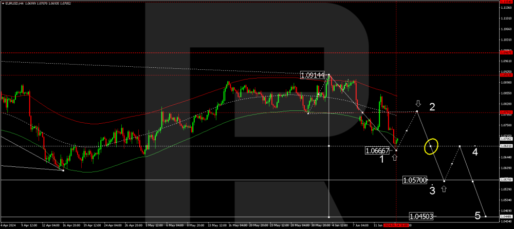 EUR continues to fall: the US dollar is to blame. Overview for 17.06.2024 The EURUSD position appears weak on Monday. The current EURUSD exchange rate stands at 1.0702. The EUR faces serious pressure due to the political imbalance in Europe and a rather mixed outlook. The euro-dollar exchange rate has declined by 0.8% over the last week, marking the maximum weekly fall since April and giving a reason for a detailed forecast for EURUSD on 17 June 2024. The market is speculating on the risks of a budget crisis in the eurozone. This pertains to the situation in France, where the confrontation between the right and left parties is reaching a new level ahead of snap parliamentary elections, with increasing pressure on President Emmanuel Macron’s centrist administration. All these factors increase the likelihood of implications for the economy in the heart of the eurozone. This situation appears significant and dubious and is unlikely to be resolved soon. A fall in the euro rate indirectly benefits the US dollar. Despite a massive sell-off in the French financial markets last week, the European Central Bank does not plan to initiate an emergency purchase of French bonds. Technical analysis EURUSD As the analysis for 17 June 2024 shows, EURUSD is developing another decline wave towards 1.0450. On the H4 chart, the market formed the first structure of this wave, with a target at 1.0666. Today, a consolidation range is expected to form above this level. With an upward breakout, a correction towards 1.0790 might follow. Once the correction is complete, a new decline structure in the EURUSD exchange rate could start, aiming for 1.0680. A breakout of this level will open the potential for a decline wave towards the local target of 1.0570. With a downward breakout of the range, a decline wave to 1.0570 is possible. Technically, this scenario is confirmed by the Elliott Wave structure and a wave matrix with a pivot point at 1.0680. The market has completed a decline to the lower boundary of the Envelope, with a rise to its upper boundary being expected. Read more - EURUSD Attention! Forecasts presented in this section only reflect the author’s private opinion and should not be considered as guidance for trading. RoboForex bears no responsibility for trading results based on trading recommendations described in these analytical reviews. Sincerely, The RoboForex Team -