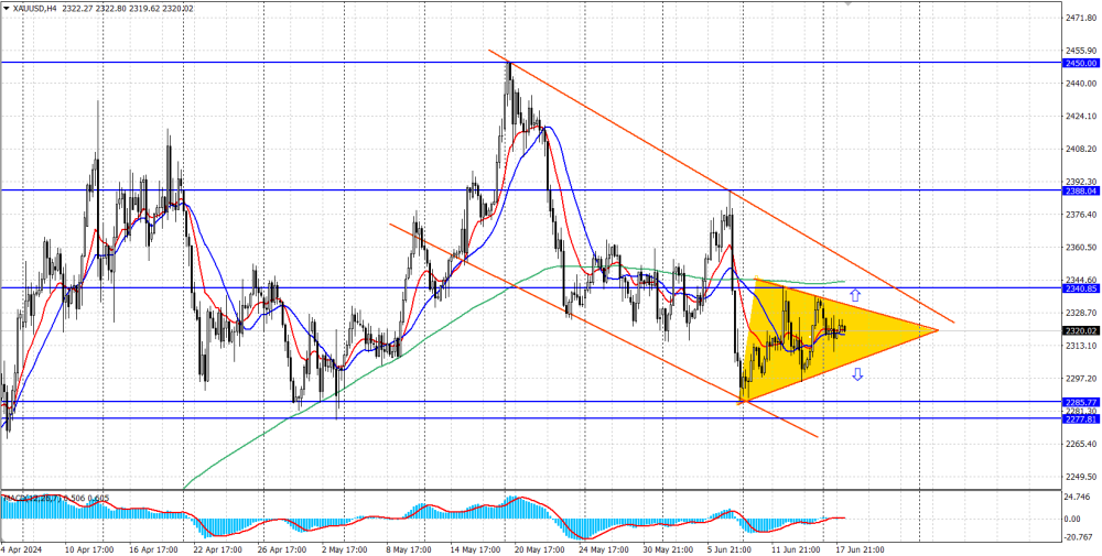 Gold is correcting, facing pressure from a strong US dollar Gold prices continue to correct after reaching an all-time high of 2,450 USD per troy ounce. Pressure mostly comes from the strengthening US dollar, which has received support after last week’s Federal Reserve meeting. The interest rate remained unchanged at 5.5%, and comments indicated that economic activity continues to increase steadily, with job gains remaining high and the unemployment rate low. Although market participants hoped for a signal from the Federal Reserve about an upcoming interest rate reduction amid slowing US inflation, this did not occur. Analysts anticipate one interest rate cut of 0.25% by the end of the year. Meanwhile, gold has experienced steady growth of approximately 12.5% since the beginning of the year. This rise is driven by fundamental factors: the US treasury bond market is gradually losing its share as the main global reserve asset, with world central banks partially selling US treasury bonds and purchasing gold instead. XAUUSD technical analysis On the H4 chart, gold quotes are experiencing a correction within a descending price channel after reaching a high of 2,450 in May. The price is currently hovering near the 2,320 mark, with a Triangle technical pattern forming on the chart. The direction of the price movement out of this pattern may indicate the near term. According to the forecast, if the quotes exit the Triangle pattern upwards and secure above 2,340, this will open the potential for growth towards the 2,388 resistance level. If the price of gold declines, dropping below the lower line of this pattern, a fall might continue towards a strong support area between 2,285 and 2,277. Read more - Gold Attention! Forecasts presented in this section only reflect the author’s private opinion and should not be considered as guidance for trading. RoboForex bears no responsibility for trading results based on trading recommendations described in these analytical reviews. Sincerely, The RoboForex Team -