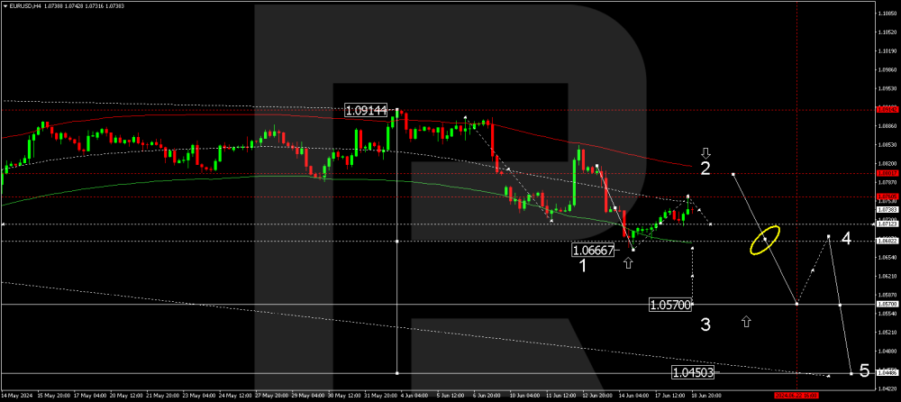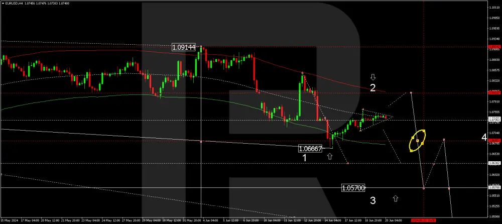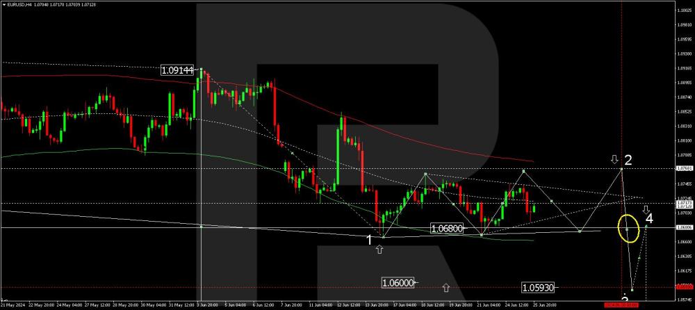 EUR is declining ahead of the Eurogroup meeting Today’s EURUSD forecast appears pessimistic as the news landscape may confirm the technical analysis conclusion about the pair’s decline. The Eurogroup meeting and a speech by ECB representative Philip R. Lane are scheduled for Wednesday. They might provide insights into the future trajectory of the eurozone’s monetary policy. The US will release data, including May 2024 new home sales, building permits, and crude oil stocks. If these indicators exceed forecasts and previous readings, they may collectively support the US dollar, which will be considered in today’s EURUSD forecast. By the end of the business day, the US will publish the results of bank stress tests the Federal Reserve conducted on 34 of the largest US banks to evaluate their ability to increase dividends and buy back shares. Although such tests are rare, their results may affect the US dollar by contributing to its strengthening or weakening, which will cause increased volatility in the market. EURUSD technical analysis On the H4 chart, EURUSD is currently in a consolidation phase around the 1.0717 level without any clear trend. With an upward breakout of the range, a correction might continue to 1.0760. After reaching this level, the price could decline to 1.0680. Subsequently, another corrective structure might develop, aiming for 1.0770 as the main target for correction. Once the correction is complete, a new decline wave is expected to start, targeting 1.0680, a crucial level for the EURUSD forecast for 26 June 2024. A breakout of this level will open the potential for a decline to 1.0610, possibly continuing to 1.0570, the estimated local target. The Elliott Wave structure and a wave matrix with a pivot point at 1.0680 technically confirm this scenario. This level is considered crucial for a downward wave in the EURUSD rate. The market has breached the Envelope’s centre and is consolidating below the 1.0717 level. The wave could decline to its lower boundary today. Read more - EURUSD Attention! Forecasts presented in this section only reflect the author’s private opinion and should not be considered as guidance for trading. RoboForex bears no responsibility for trading results based on trading recommendations described in these analytical reviews. Sincerely, The RoboForex Team -