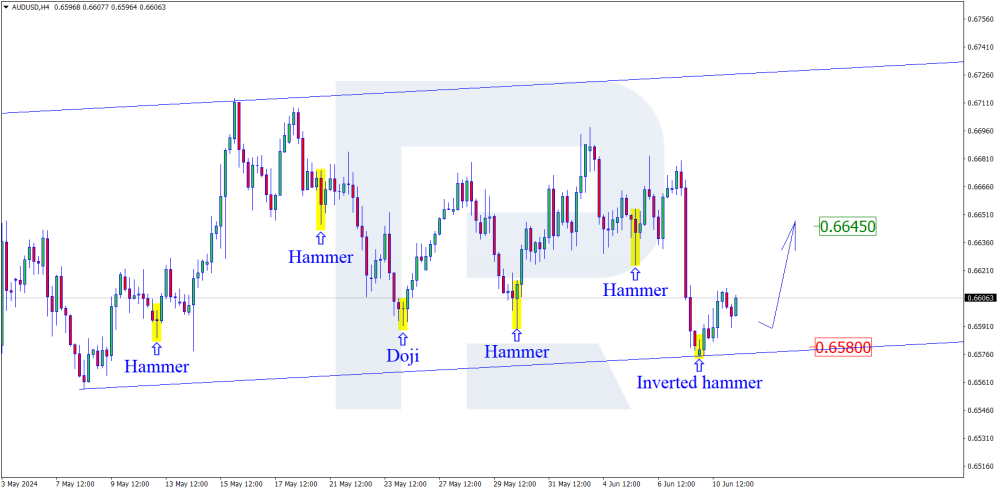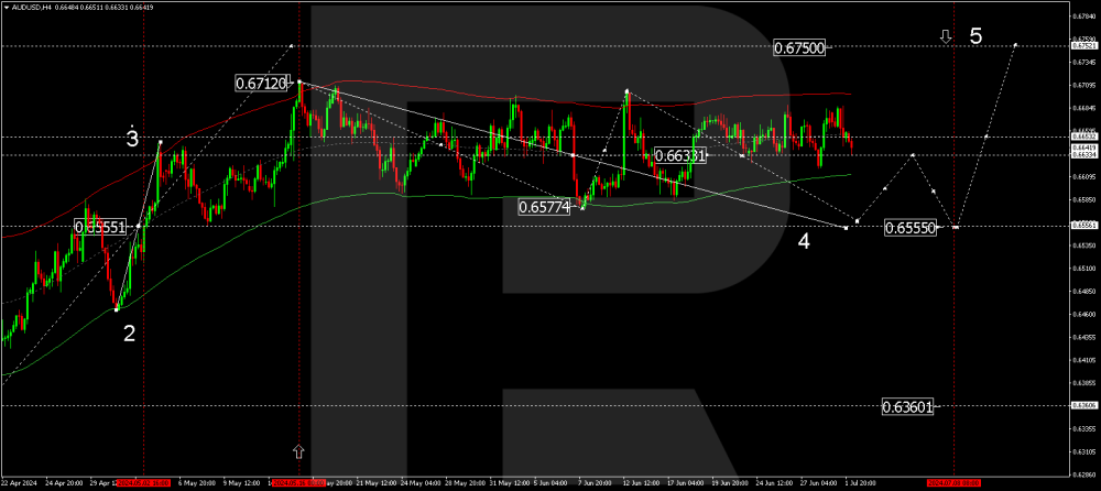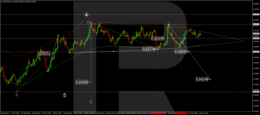 AUD rises to a two-week peak, supported by several factors The AUDUSD pair benefits from the RBA’s tough stance, the US dollar’s weakness, and attacks on the yen. The Australian dollar has reached a two-week high against the US dollar and is hovering near the 0.6660 mark. The main support for the Aussie came from the Reserve Bank of Australia, which maintains a hawkish stance on monetary policy. The RBA is expected to lower the interest rate much later than other major central banks. Thus, the markets missed nearly every chance of an interest rate cut from the RBA in 2024. Overall easing is only projected to happen by the end of 2025, with an average expectation of 43 basis points. RBA Governor Michele Bullock said that the regulator discussed the need for an interest rate hike at its June meeting without even considering a rate reduction. The AUD rate is currently benefitting from short attacks on the JPY and the local weakening of the US dollar rate. Later this week, the market will focus on Australia’s inflation data. AUDUSD technical analysis A consolidation range has formed above the 0.6630 level on the AUDUSD Н4 chart and extended to 0.6677 following an upward breakout. Subsequently, the market returned to the 0.6630 level, which is crucial for the AUDUSD forecast for 25 June 2024. With an upward breakout, the price might rise to 0.6750. A downward breakout will open the potential for a decline in the AUDUSD quotes to 0.6565. If this level breaks, the trend might continue towards 0.6424, representing an estimated target. This scenario is technically confirmed by the Elliott Wave structure and a wave matrix with a pivot point at 0.6555. The market has reached a local target of the growth wave at the Envelope’s upper boundary – 0.6710. Following this, the price declined to its lower boundary at 0.6577 as part of a correction. Today, the market continues to develop a consolidation range around the Envelope’s central line at 0.6630. With a downward breakout, a decline wave could follow, targeting the Envelope’s lower boundary at 0.6565. An upward breakout might enable a growth wave, aiming for its upper boundary at 0.6750. Read more - AUDUSD Attention! Forecasts presented in this section only reflect the author’s private opinion and should not be considered as guidance for trading. RoboForex bears no responsibility for trading results based on trading recommendations described in these analytical reviews. Sincerely, The RoboForex Team -