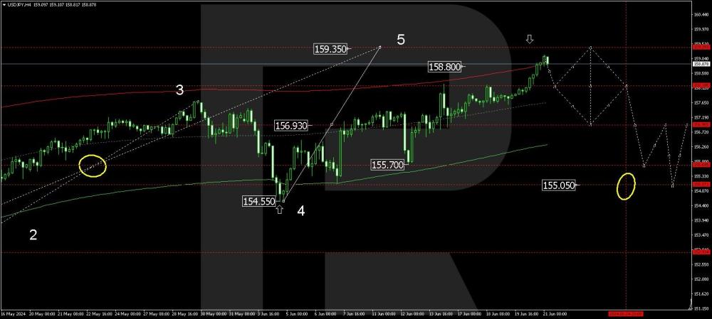 JPY struggles amid widespread decline The Japanese yen is undergoing a correction after the release of the May core consumer price index. The likelihood of continued weakening remains high. Japan released the nationwide core consumer price index for May. In the previous period, the index was 2.2%. Analysts had predicted a 2.6% rise, but the actual figure was 2.5%, indicating an improvement, although less than expected. The positive trend did not save the yen from losing positions against the US dollar. A higher index value typically suggests a positive outlook and strengthens the yen. However, in the current situation, the data did not favour the yen’s exchange rate, which has led to its further weakening. The US Federal Reserve’s report on monetary policy may “add fuel to the fire” and weaken the yen even more. USDJPY technical analysis On the USDJPY H4 chart, the fifth corrective wave continues to develop, with a target at 159.35. The price has reached the local target of 158.80. Today, 21 June 2024, a consolidation range is expected to form around this level. A downward breakout of the range will open the potential for a decline to 158.20 (testing from above), followed by a rise towards 159.35, representing the main target for correction. Once the correction is complete, a decline wave might start, aiming for 155.50. This USDJPY rate scenario is technically confirmed by the Elliott Wave structure and a correction matrix with a pivot point at 155.70. The market has completed a growth structure towards the Envelope’s upper boundary at 158.80. A decline wave is expected to begin, targeting its centre – 158.20, with an onward growth wave structure aiming for 159.35 as the main target. Read more - USDJPY Attention! Forecasts presented in this section only reflect the author’s private opinion and should not be considered as guidance for trading. RoboForex bears no responsibility for trading results based on trading recommendations described in these analytical reviews. Sincerely, The RoboForex Team -