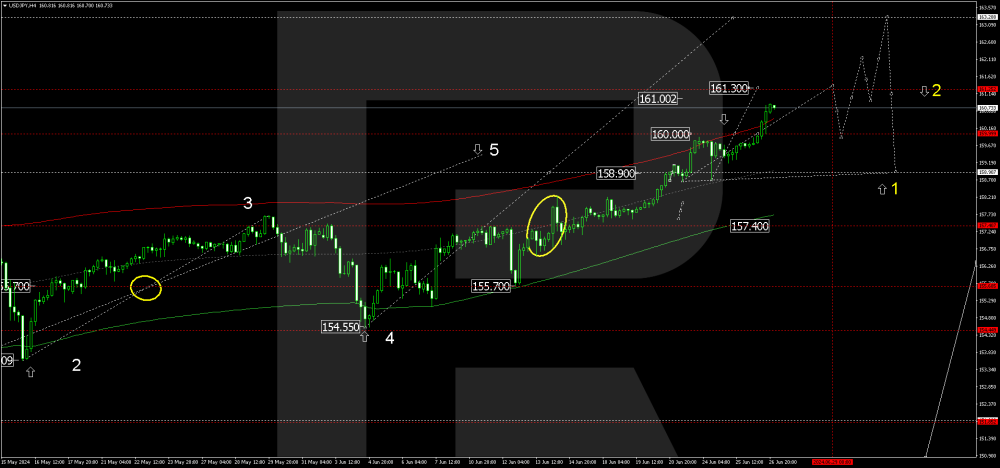 JPY falling due to fundamental discrepancies in Fed and BoJ policies The USDJPY rate declined on Thursday, 27 June 2024, unable to hold at the 38-year high of 160.85 reached on Wednesday. The Japanese authorities expressed concerns about the sharp decline in the yen. The country’s major financial policymaker, Masato Kanda, said they were closely watching the situation and were ready to act. Renowned currency analyst Masafumi Yamamoto warns that the USDJPY rate may rise to 162.00 if the Japanese authorities do not take prompt action to support the national currency. However, traders are unsure whether the Japanese authorities’ verbal or actual actions can halt the yen’s decline. The yen’s weakness is attributed to investor uncertainty about the pace of Fed interest rate cuts. The opinion is that if the BoJ slightly adjusts its zero-rate policy at the 30-31 July meeting, this will unlikely significantly impact the yen rate. USDJPY technical analysis On the USDJPY H4 chart, the market received support at 160.00. Today, 27 June 2024, a rise to 161.30 is possible, followed by a correction to 160.00 (testing from above). Subsequently, the price could rise to 162.00, potentially continuing the uptrend to 163.30. Once this wave is complete, a decline might start, aiming for 158.90 as the first target. The Elliott Wave structure and a wave matrix with a 158.90 pivot point technically confirm this USDJPY scenario. The market has received support at the Envelope’s central line and continues growth to its upper boundary. A decline wave is expected from the 161.30 level to the Envelope’s centre at 160.00. Subsequently, a consolidation range could form around this level. With an upward breakout, the growth wave might expand to 163.30. A decline wave aiming for the Envelope’s lower boundary is expected only after the price reaches this level. Read more - USDJPY Attention! Forecasts presented in this section only reflect the author’s private opinion and should not be considered as guidance for trading. RoboForex bears no responsibility for trading results based on trading recommendations described in these analytical reviews. Sincerely, The RoboForex Team -