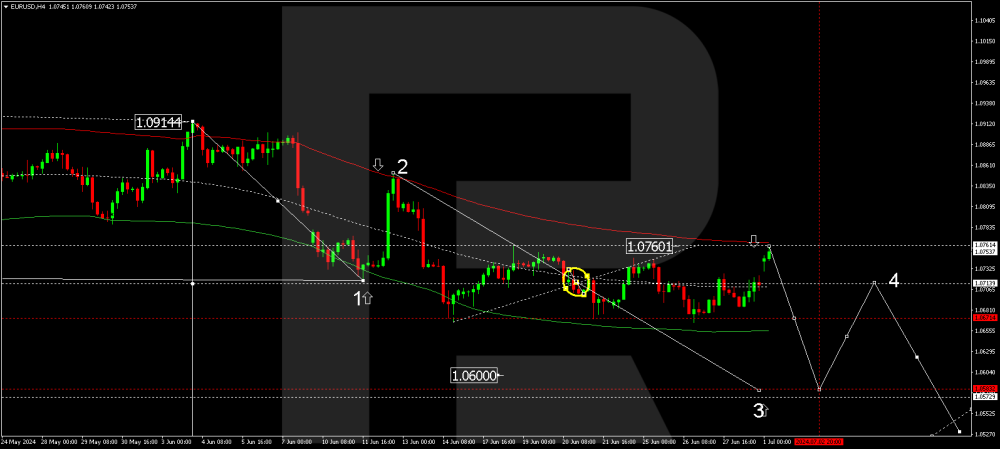 EUR has risen: all eyes on French policy The EURUSD pair partially recovered its previous decline on Monday. The far-right party was not strong enough in the first round of the French election, which was positive for the market. EURUSD starts the week rising. The EURUSD pair increased to 1.0753 and returned to levels seen on 13 May. Investors are now primarily focused on data from the first round of the French snap election. Although the far-right was again winning, it did not appear as strong as before, favouring observers and boosting the EUR rate. Marine Le Pen’s far-right National Rally (RN) won the first round of the parliamentary election on Sunday. However, the party secured fewer votes than expected. The euro has declined since France’s President Emmanuel Macron called snap elections. EURUSD technical analysis On the H4 chart, EURUSD is currently in a consolidation phase around the 1.0714 level. This level is considered crucial for the current decline wave in the EURUSD pair. Today, 1 July 2024, a corrective phase is expected, targeting 1.0760. Subsequently, a decline wave might start, aiming for 1.0600 and potentially continuing to the local target of 1.0573. The Elliott Wave structure with the centre at 1.0714 technically confirms this scenario. From the fundamental analysis perspective, the EURUSD pair is supported. Upcoming economic reports will be crucial for determining short-term movements in the EURUSD rate. Technical indicators point to a further decline to the 1.0600 and 1.0573 targets. Read more - EURUSD Attention! Forecasts presented in this section only reflect the author’s private opinion and should not be considered as guidance for trading. RoboForex bears no responsibility for trading results based on trading recommendations described in these analytical reviews. Sincerely, The RoboForex Team -