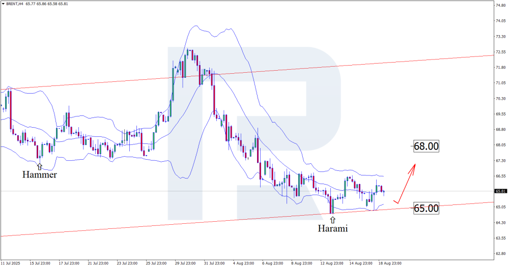 Brent surges upwards: correction may pave the way for a new price rally Geopolitical risks and possible production increases are playing a tricky role with Brent quotes, which may rise to 68.00 USD. Discover more in our analysis for 19 August 2025. Brent technical analysis Having tested the lower Bollinger Band, Brent prices formed a Harami reversal pattern on the H4 chart. At this stage, prices are following the signal, moving higher. The Brent forecast for 19 August 2025 suggests a growth target of 68.00 USD. The increase in oil production from September may reduce prices in the future, but for now, Brent technical analysis suggests growth towards the 68.00 USD resistance area. Read more - Brent Forecast Attention! Forecasts presented in this section only reflect the author’s private opinion and should not be considered as guidance for trading. RoboForex bears no responsibility for trading results based on trading recommendations described in these analytical reviews. Sincerely, The RoboForex Team -