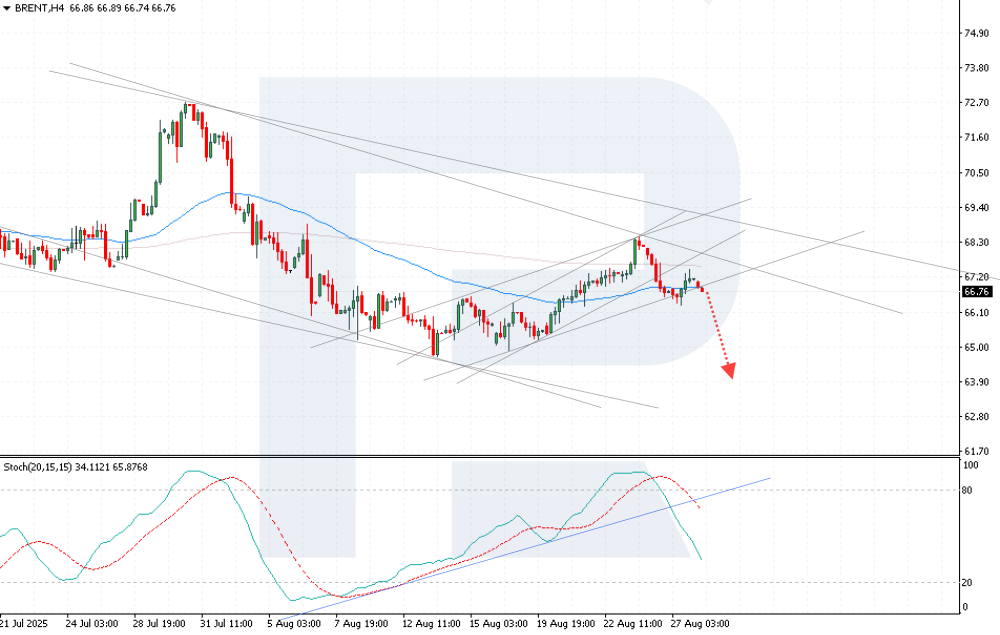 Brent under pressure: end of summer season weighs on fuel demand The oil market remains under pressure, with Brent quotes edging lower amid expectations of weaker demand and geopolitical factors, currently standing at 66.76 USD. Find more details in our analysis for 28 August 2025. Brent technical analysis Brent quotes are retreating after rebounding from the 68.50 resistance level, remaining within a descending channel. The current dynamics suggest a strong likelihood of a bearish impulse towards 63.90 USD. Brent quotes continue to face pressure, with expectations of declining US demand and uncertainty over India’s oil imports increasing the risk of bearish dynamics. Read more - Brent Forecast Attention! Forecasts presented in this section only reflect the author’s private opinion and should not be considered as guidance for trading. RoboForex bears no responsibility for trading results based on trading recommendations described in these analytical reviews. Sincerely, The RoboForex Team -